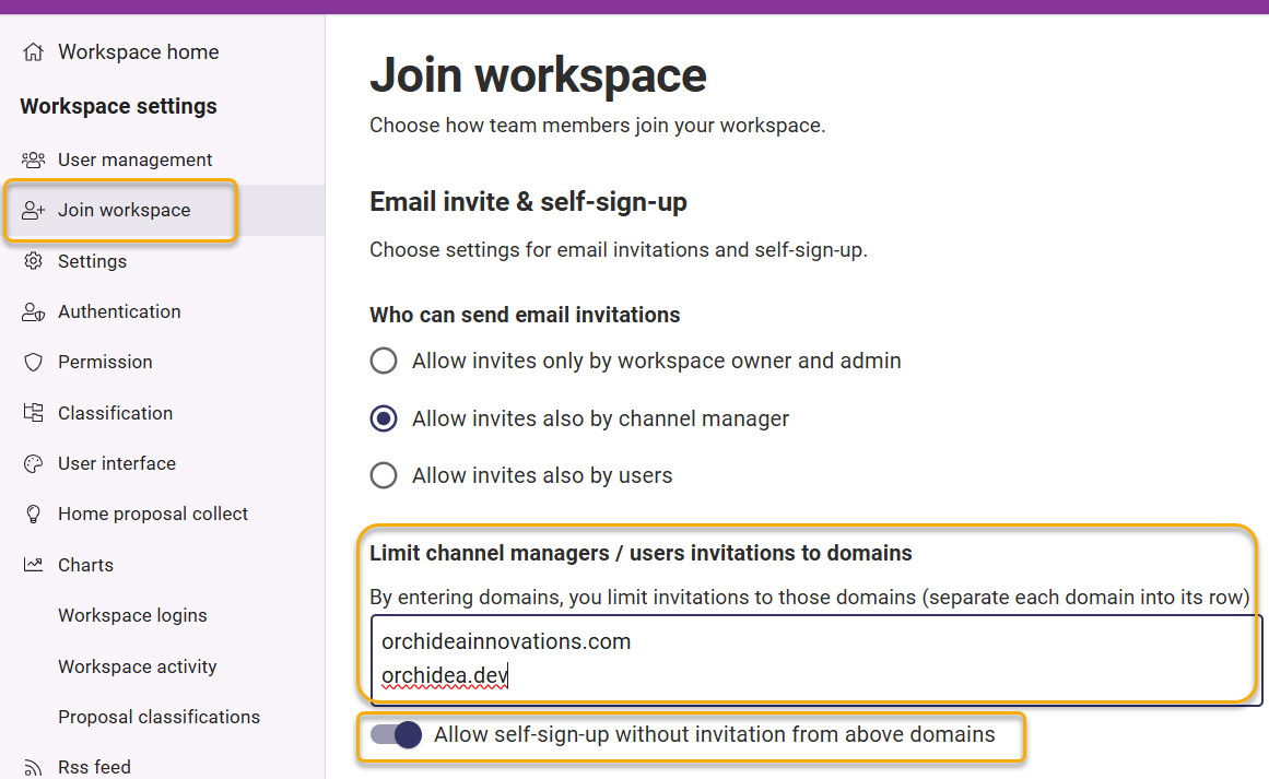 - If you want a new account to be automatically created for a user using this IDP and therefore added domains in 15. d above, you have to add the same domains also to the Join workspace section. Add the same domains to Limit channel managers/users' invitations to domains. Turn on also the setting Allow self-sign-up without invitation from above domains. Here is a link to a related article.