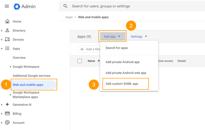 - Click Web and mobile apps on the left side navigation in Google Admin. Then, from the Add app menu select Add custom SAML app.