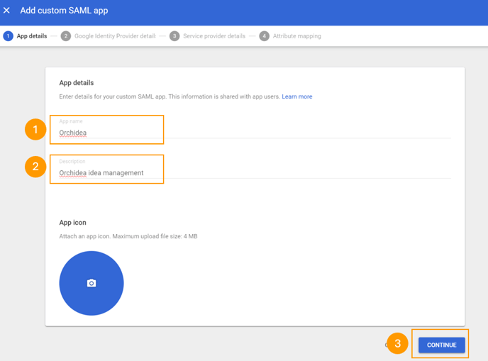 - 1. Add "https://app.orchidea.dev/api/saml/login/" to ACS URL as place holder address. This will be changed later. 2. Add "https://orchidea.dev" to Entity ID. 3. Select "Signed response" check box. 4. Choose EMAIL as Name ID format and click Continue