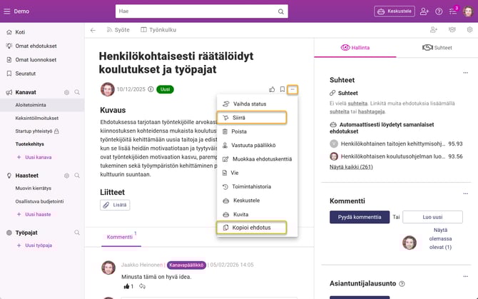 Voit kopioida tai siirtää yhden tai useamman ehdotuksen toiseen kanavaan, haasteeseen tai työpajaan.